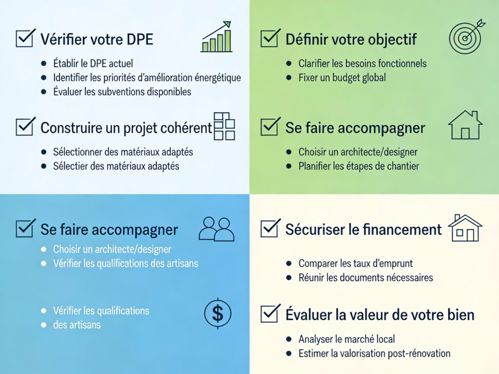 Se faire aider dès le début par un professionnel (Mon Accompagnateur Rénov ou un bureau d’études) pour bâtir un programme de travaux qui permet vraiment de gagner les classes DPE nécessaires.